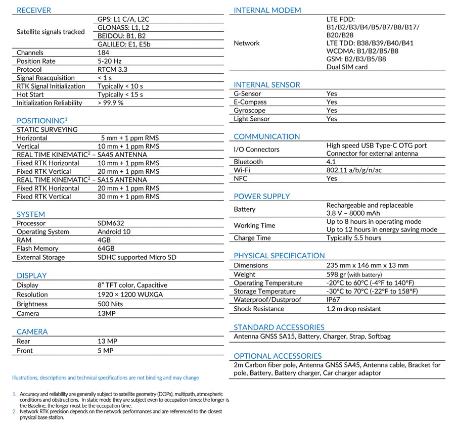 S70G is a 4-constellation dual frequency GNSS system (GPS, GLONASS, Galileo and BeiDou) that allows to collect data and photos in the field, in an easy and fast way. It is supplied with an antenna connected directly to the tablet which guarantees 2cm accuracy, but if required, connecting an external antenna it gains even more precise data.