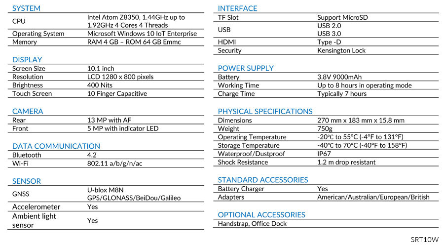 SRT10W is the new 10.1” (inches) Stonex tablet with Windows 10 IoT Enterprise OS. Thanks to its robustness and reliability, this device is suitable for working in demanding environments.